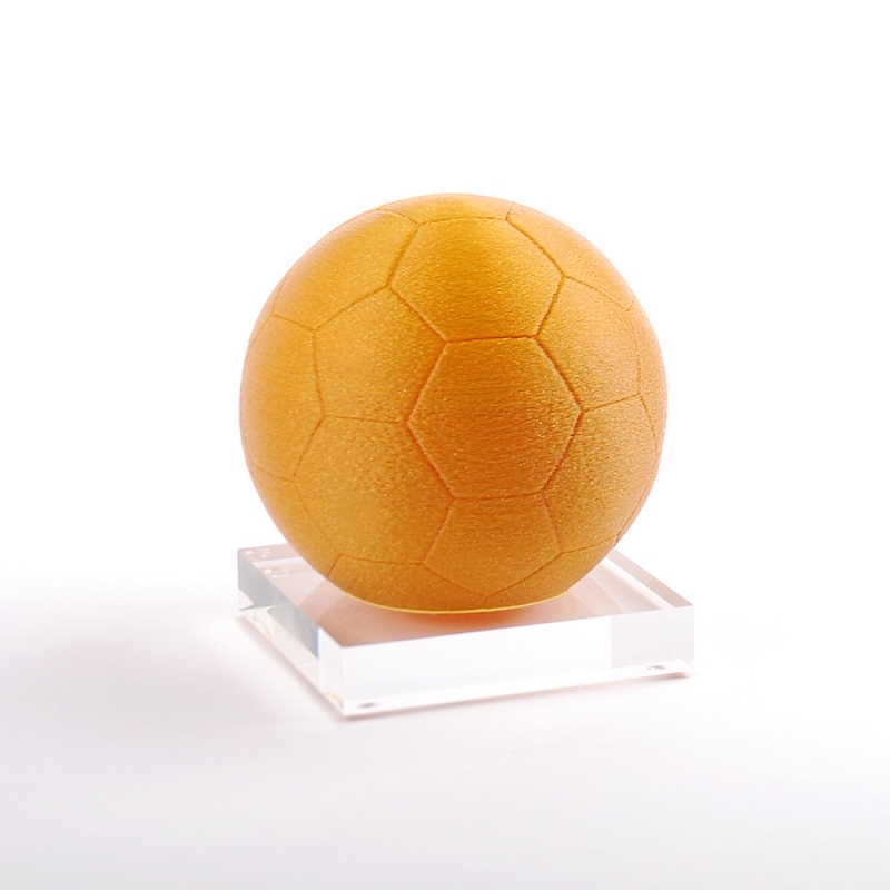 Trofeo personalizable en forma de balón fabricado de forma artesana con placas de metacrilato transparente (Plexiglas®-PMMA) de alto espesor y PLA color ORO (Acido poliláctico) con efecto texturizado. Fabricación artesana realizada con alta tecnología de calidad en impresión 3D FDM. Cantos suaves y pulidos incoloros extra brillantes en la base. Personalizable con impresión digital mediante tintas ECO-UV de alta calidad y resistencia con gran nitidez de colores de amplia profundidad en la base. Made in Spain.