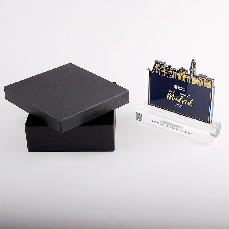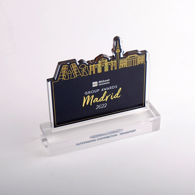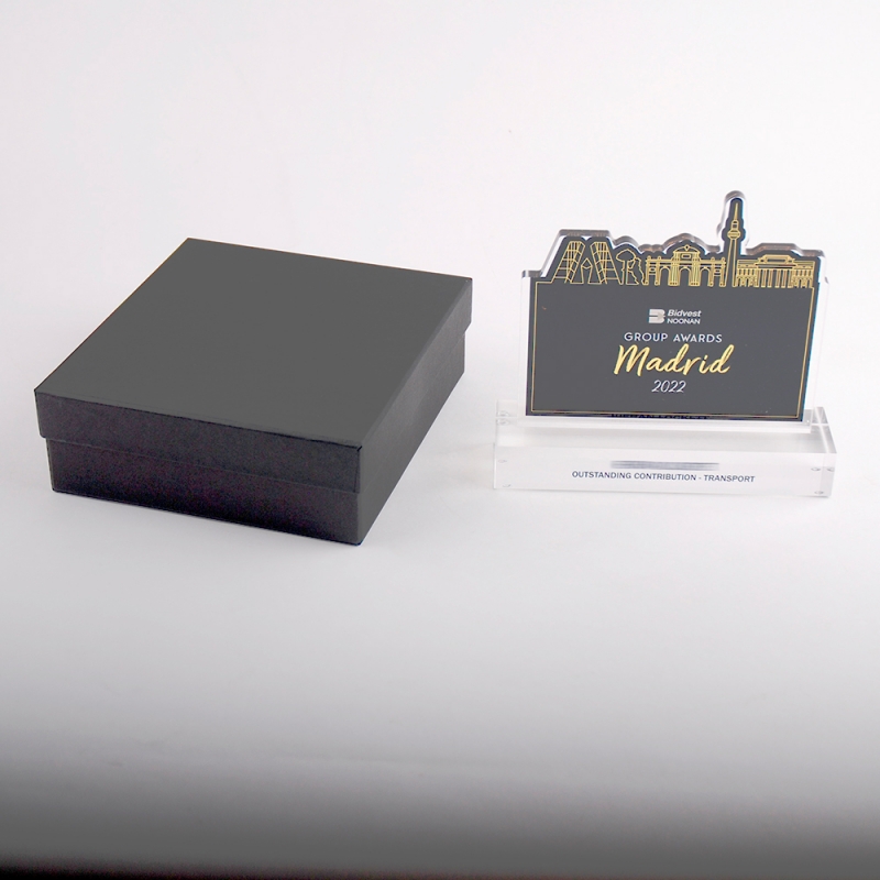 Trofeo de metacrilato realizado ad-hoc con motivo de los premios BIDVEST NOONAN MADRID 2022.