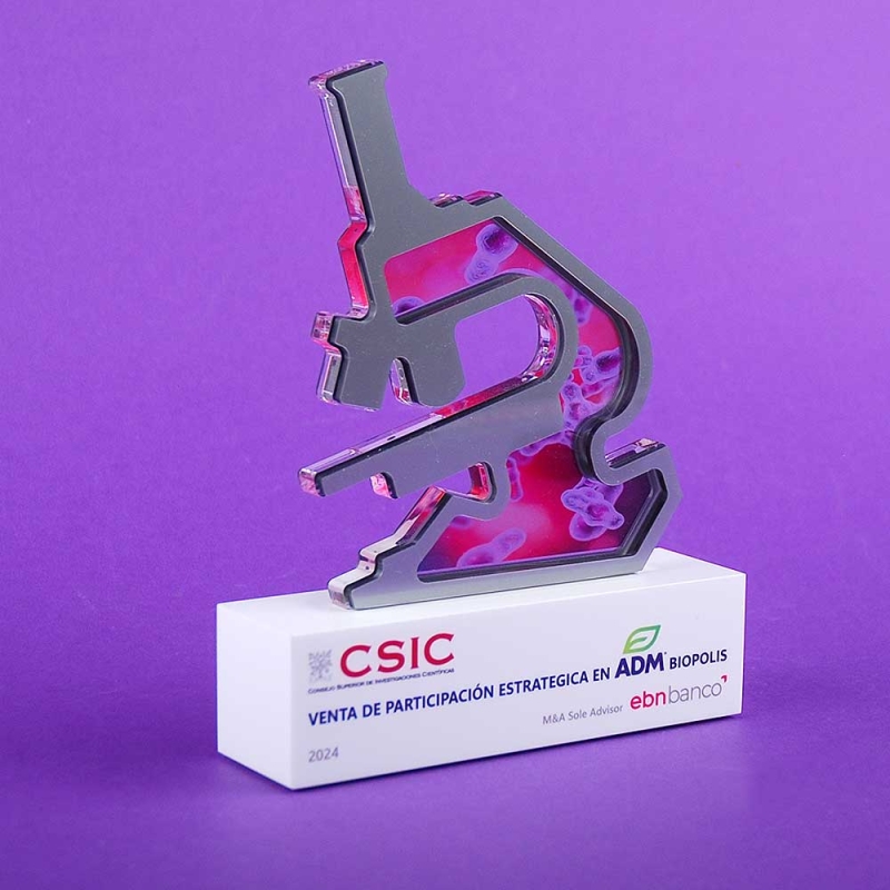 Trofeo de metacrilato realizado a medida para CSIC en colaboración con EBN BANCO.