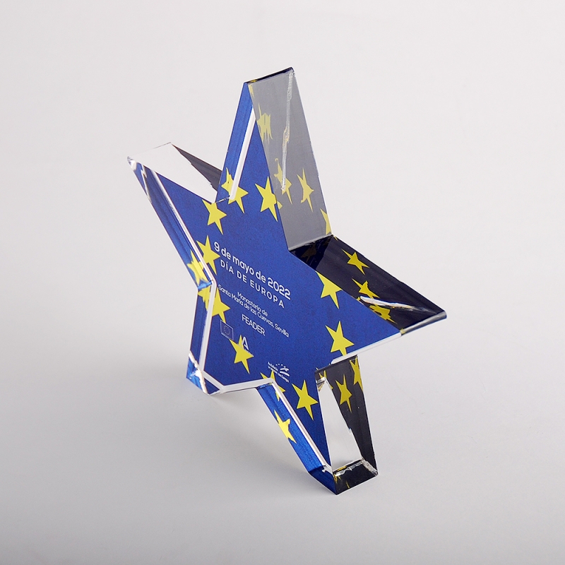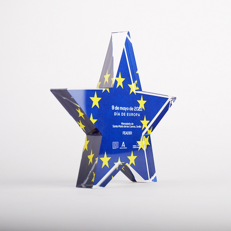 Trofeo de metacrilato realizado a medida con motivo de la entrega de premios DIA DE EUROPA 2022 en Monasterio Santa Maria de las Cuevas, Sevilla.