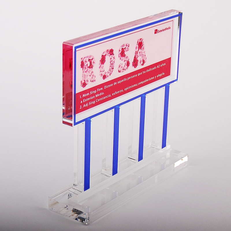 Trofeo premio de metacrilato realizado a medida para la compañía EXTERION MEDIA con motivo de homenaje a trabajadora de la empresa.