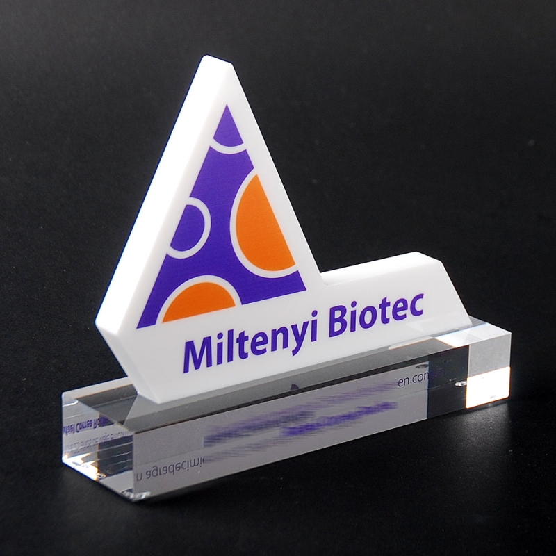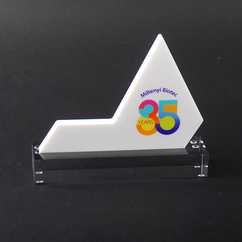 Trofeo de metacrilato realizado ad-hoc con motivo del aniversario de MILTENYI BIOTEC.