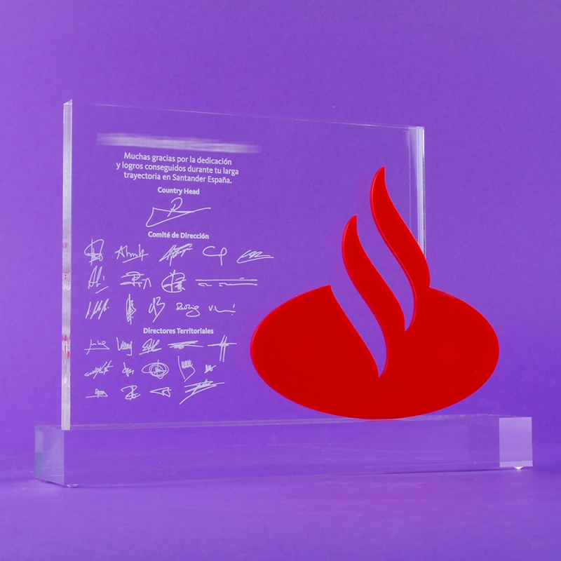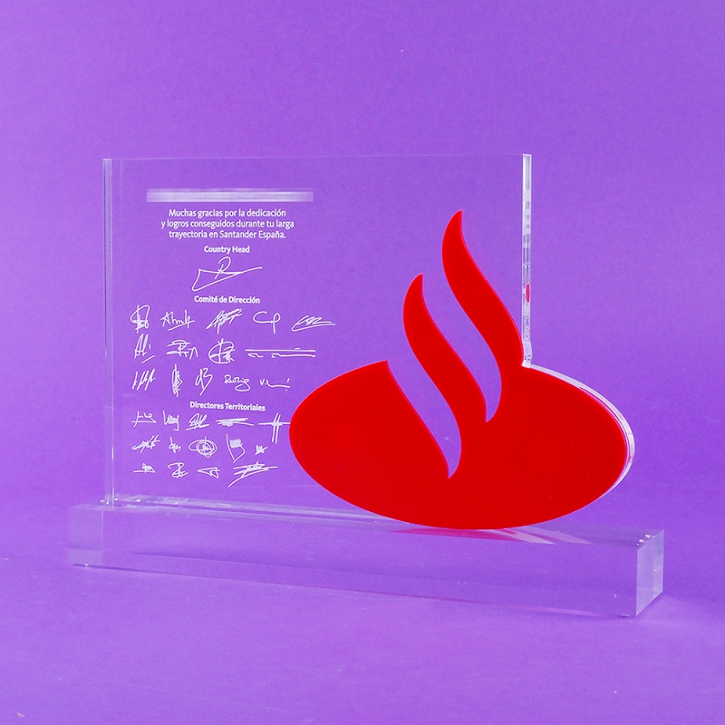 Trofeo metacrilato diseñado y fabricado para entidad financiera BANCO SANTANDER con motivo de homenaje especial a empleado de la compañía.