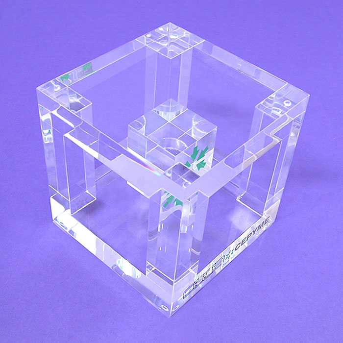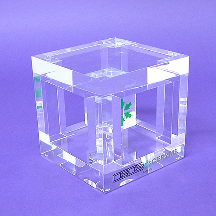 Fabricados de forma artesana con placas de metacrilato transparente (Plexiglas-pmma) alto espesor y marcados con impresión digital directa con logotipos facilitados por el cliente.