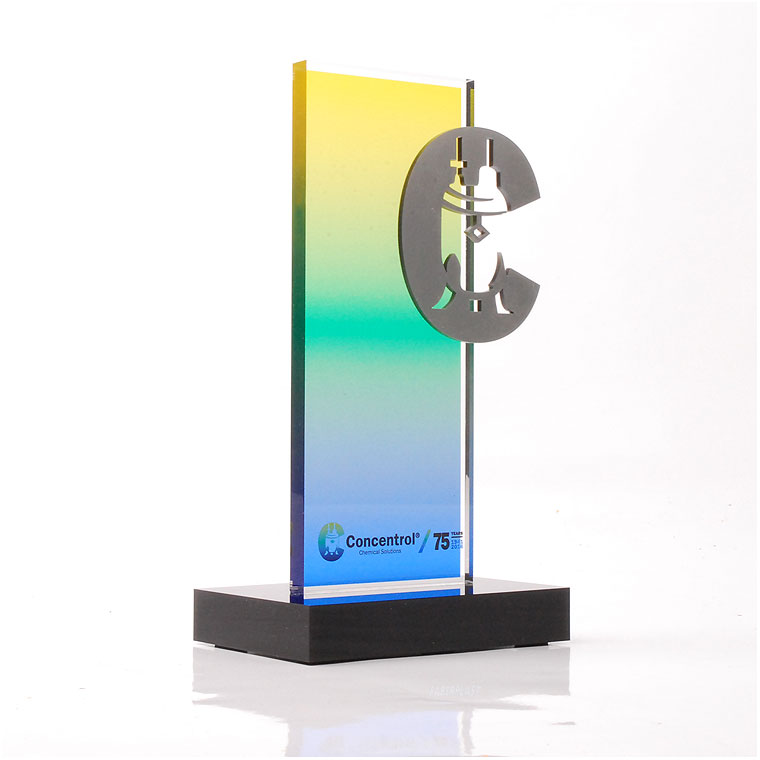 Trofeo metacrilato elaborado a medida para la compañia CONCENTROL. Fabricados con placas de metacrilato transparente (Plexiglas-pmma) y metacrilato negro. Incluyen impresión digital en cuatrocromía degradada según diseño cliente y pieza silueteada por láser de metacrilato gris plata.