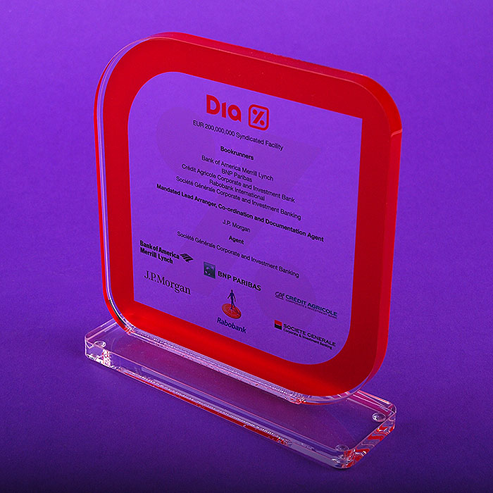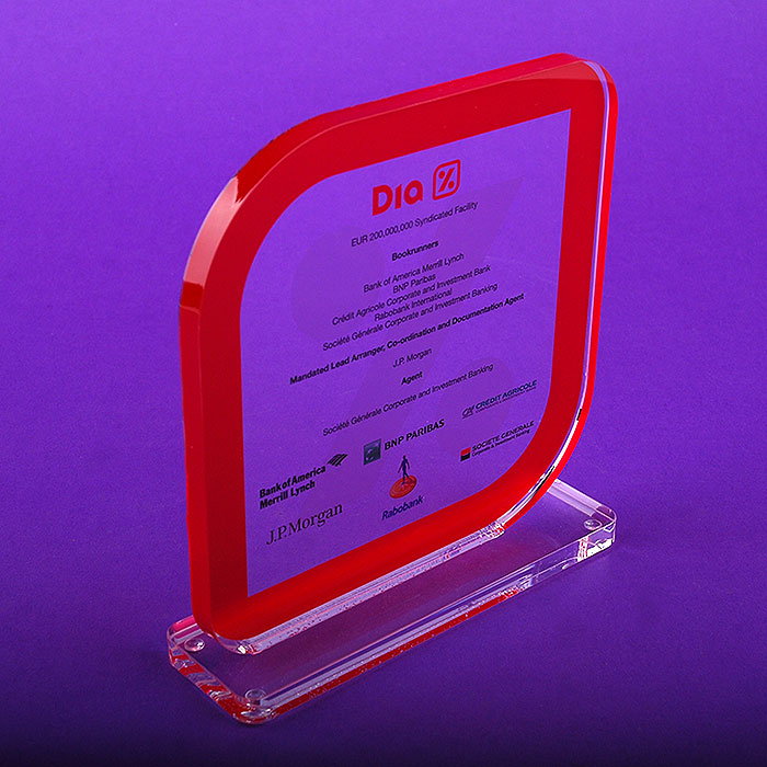 Trofeo corporativo de metacrilato realizado a medida para la compañía DIA.