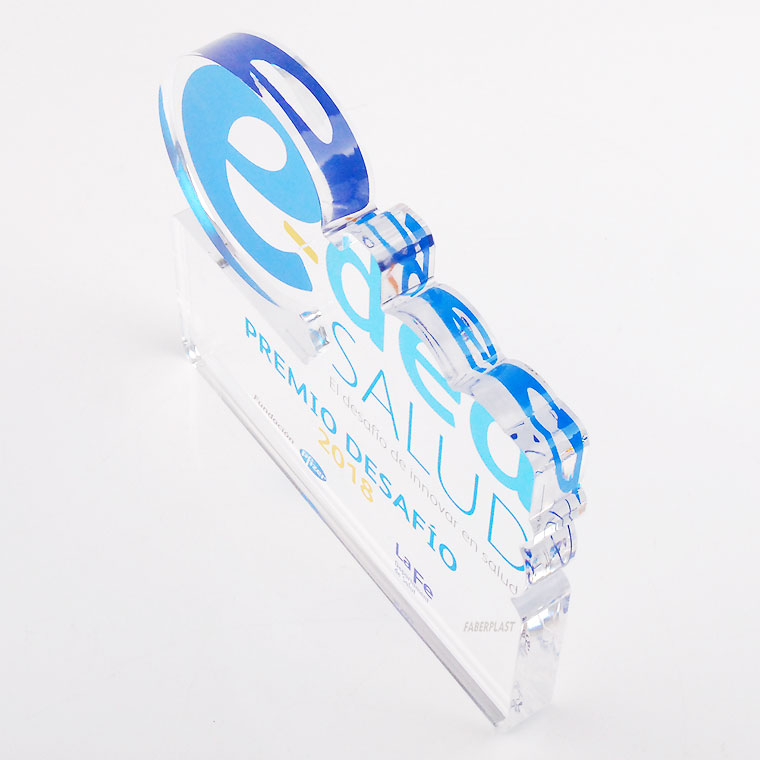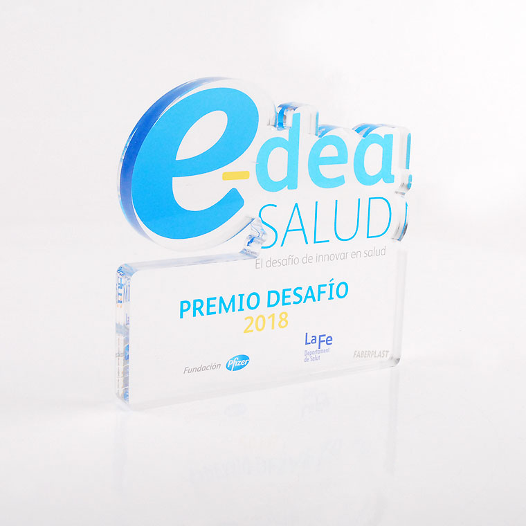 Trofeo de metacrilato realizado ad-hoc para el desafio E-Dea Salud de la Fundación Pfizer.