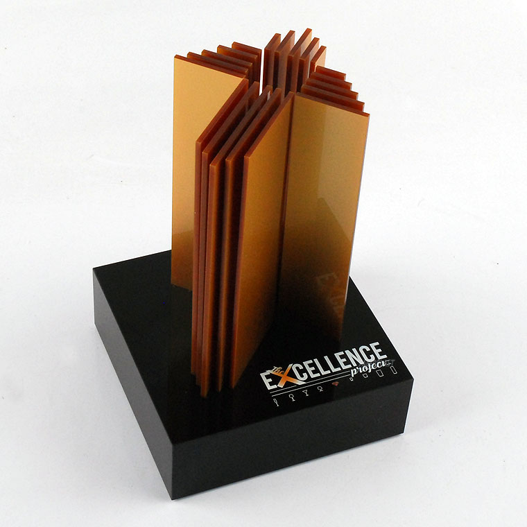 Trofeo metacrilato realizado para el concurso de coctelería: EXCELLENCE PROJECT. Fabricados con placas de metacrilato negro y oro brillo (Plexiglas-pmma). Con impresión digital directa de alta calidad en la base con diseño aportado por el cliente.