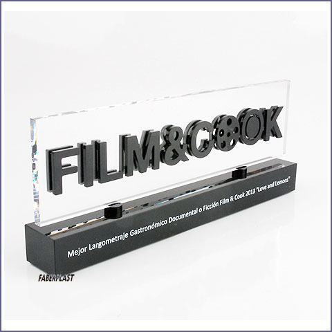 Trofeo de metacrilato realizado para el evento y gala de entrega de premios FILM & COOK 2013 http://www.filmandcook.com/ Fabricados a medida en metacrilato transparente y metacrilato negro (Plexiglas-pmma) silueteado por laser. Incluye impresión digital directa de nombres y categorias premiadas en base.