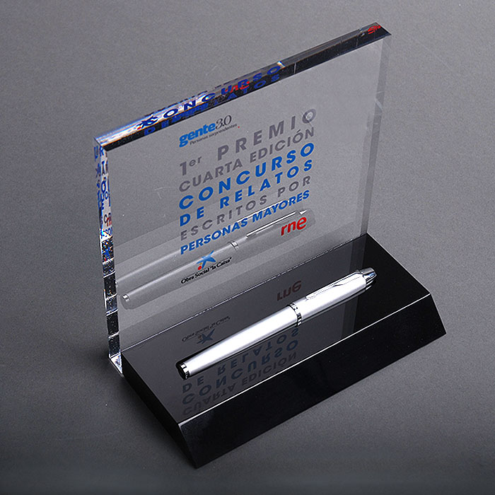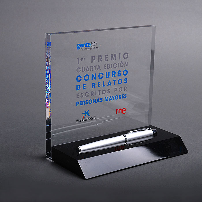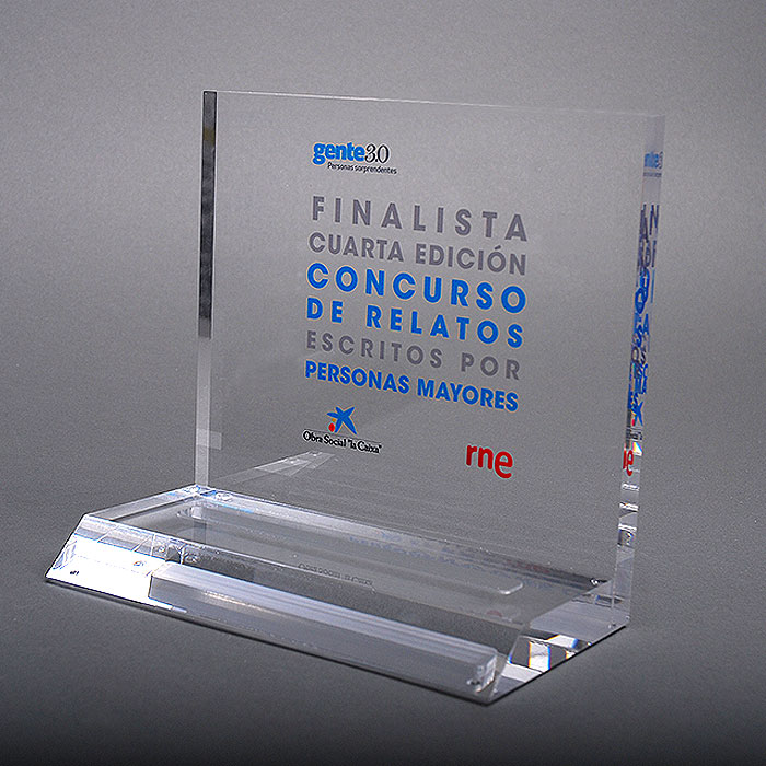 Trofeos de metacrilato realizados de forma personalizada para la entrega de premios GENTE30 del concurso de relatos OBRA SOCIAL LA CAIXA y RNE.