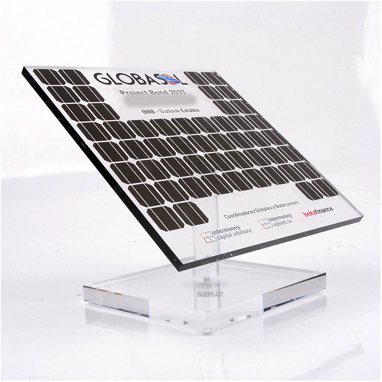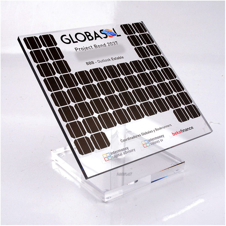 Trofeo metacrilato realizado a medida con forma de placa solar, para la compañia de energias renovables GLOBASOL. Fabricados con placas y barra de metacrilato transparente (Plexiglas-pmma) e impresos mediante impresión digital directa con logotipos y diseño facilitado por el cliente.