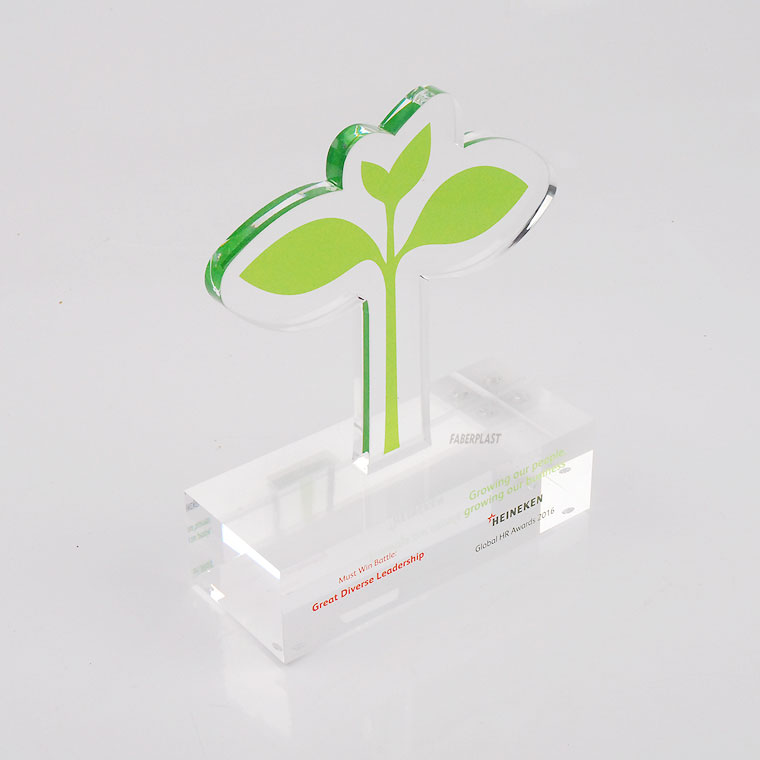 Trofeo metacrilato realizado a medida para la compañia HEINEKEN. Fabricados con placas de metacrilato transparente (Plexiglas-Pmma) silueteados por láser con forma segun indicaciones cliente. Decorados con impresión digital directa con logotipo, textos y diseño de la compañia.
