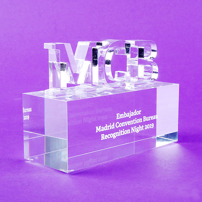 Sencillo, pero realmente elegante trofeo de metacrilato realizado ad-hoc con motivo de los premios MCB (Madrid Convention Bureau).