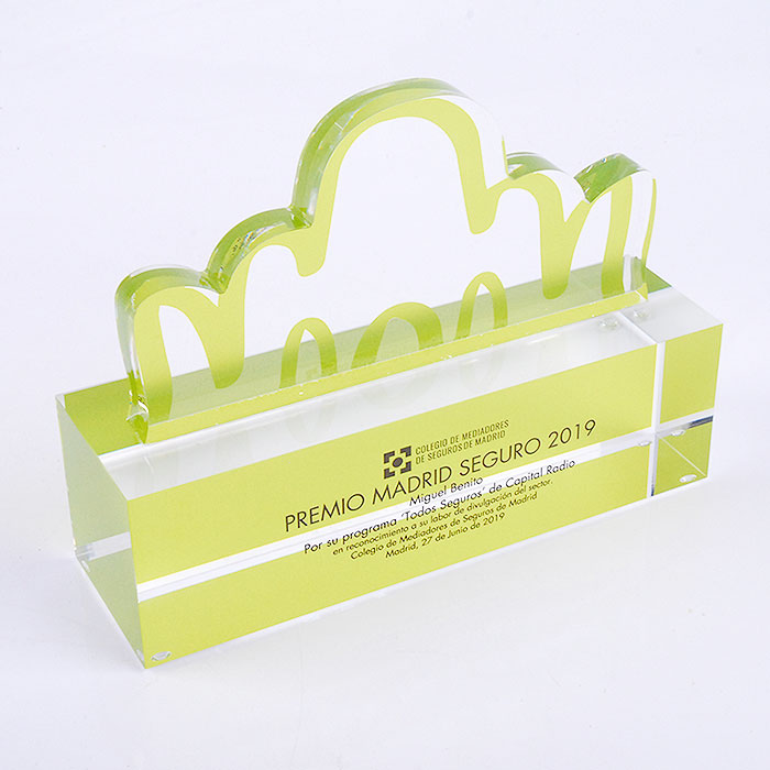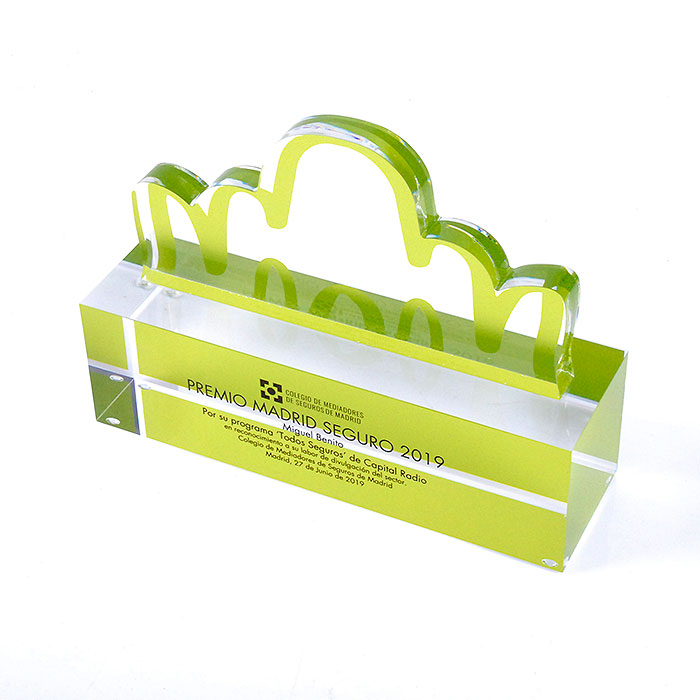 Trofeo de metacrilato realizado a medida y bajo diseño, para el colegio de mediadores de seguros de Madrid: PREMIO MADRID SEGURO 2019.