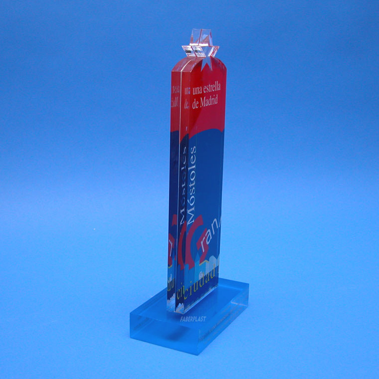 Trofeo de metacrilato realizado a medida con motivo de un evento y entrega de premios del Ayuntamiento de Móstoles.