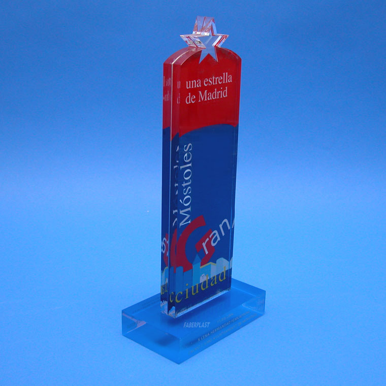 Fabricados con placas de metacrilato transparente (Plexiglas-pmma) en base y placa superior, con impresión digital personalizada en base con nombre de premiados e impresión digital en cuatricromía en las dos placas superiores formando un sándwich e impreso a dos caras. Incluye silueteado de estrella mediante procesado láser.