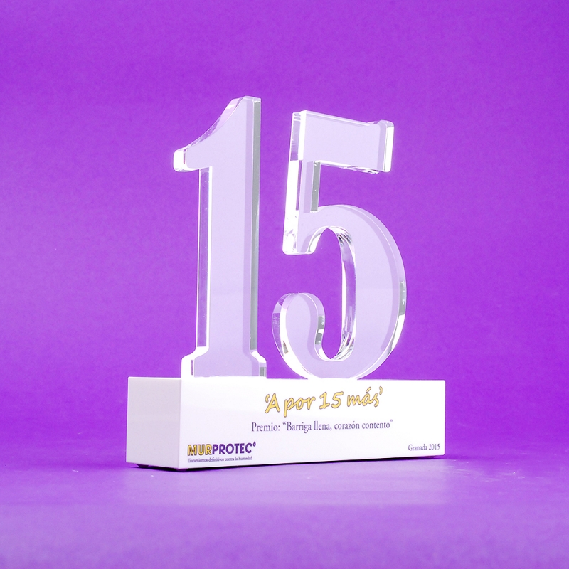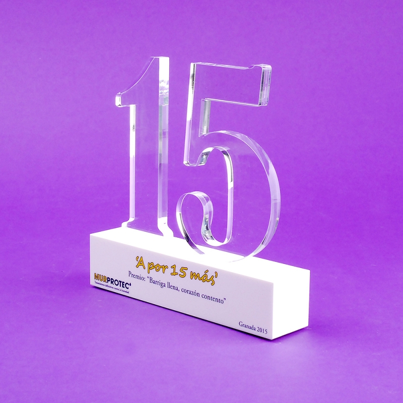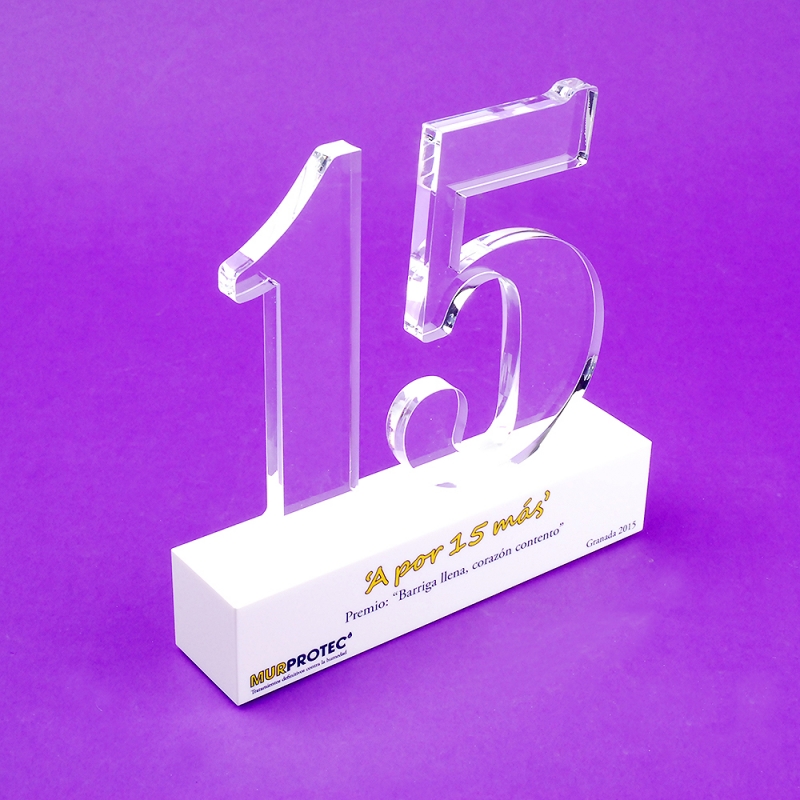 Trofeos en formato bloque con números silueteados por láser y fabricados de forma artesana con placas de metacrilato (Plexiglas®-PMMA) de alto espesor en nuestros talleres propios. Made in Spain. Con impresión digital y tintas ECO-UV de alta calidad, colores nítidos y profundos fieles al diseño facilitado por el cliente. Cantos suaves y pulidos incoloros con alto brillo gracias a nuestras minuciosas técnicas de trabajo.