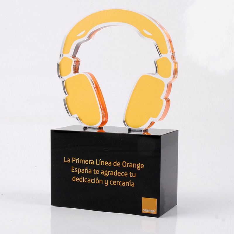 Trofeo de metacrilato personalizado para la compañia de telefonía ORANGE. Fabricados con placas de metacrilato transparente y negro alto brillo (Plexiglas®-PMMA) de alto espesor. Con decoración mediante impresión digital de alta calidad con tintas ECO-UV.