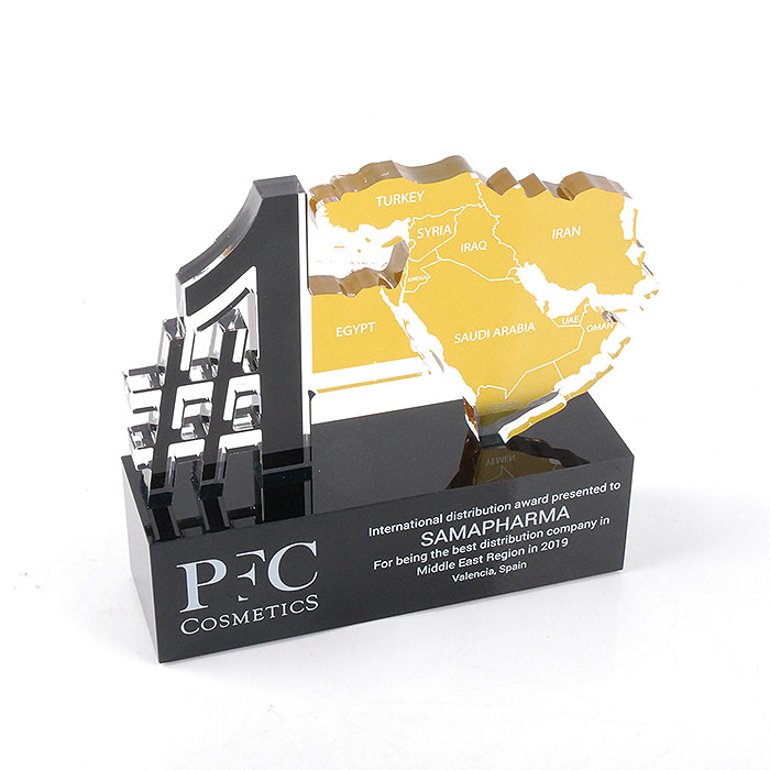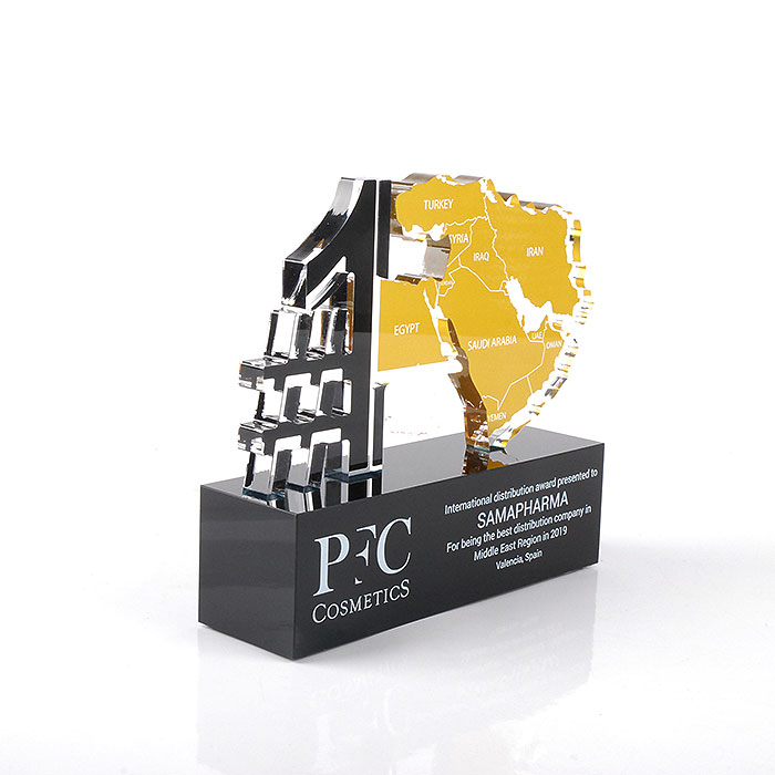 Trofeo de metacrilato realizado de forma personalizada para la marca: PFC COSMETICS.