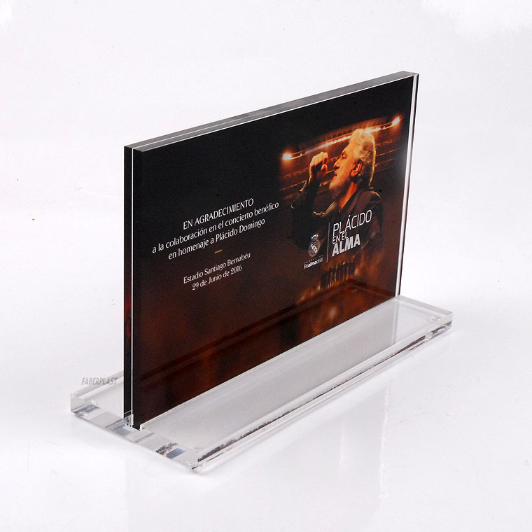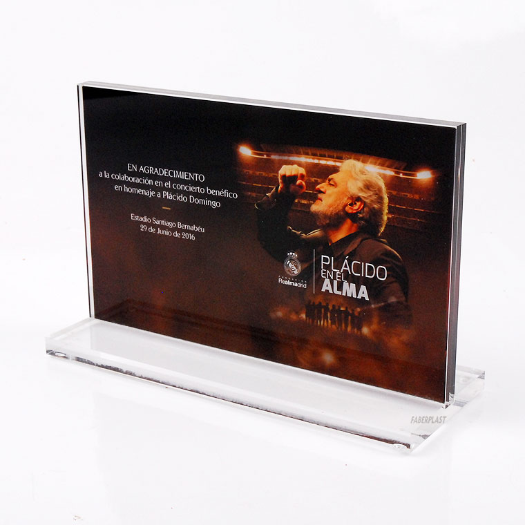 Trofeo metacrilato realizado a medida para concierto PLACIDO DOMINGO en Estadio Santiago Bernabéu del Real Madrid C.F. Fabricados con placas de metacrilato transparente (Plexiglas-pmma) impresos a doble cara (trasera y delantera) mediante impresión digital directa de alta resolución con cartel del evento.