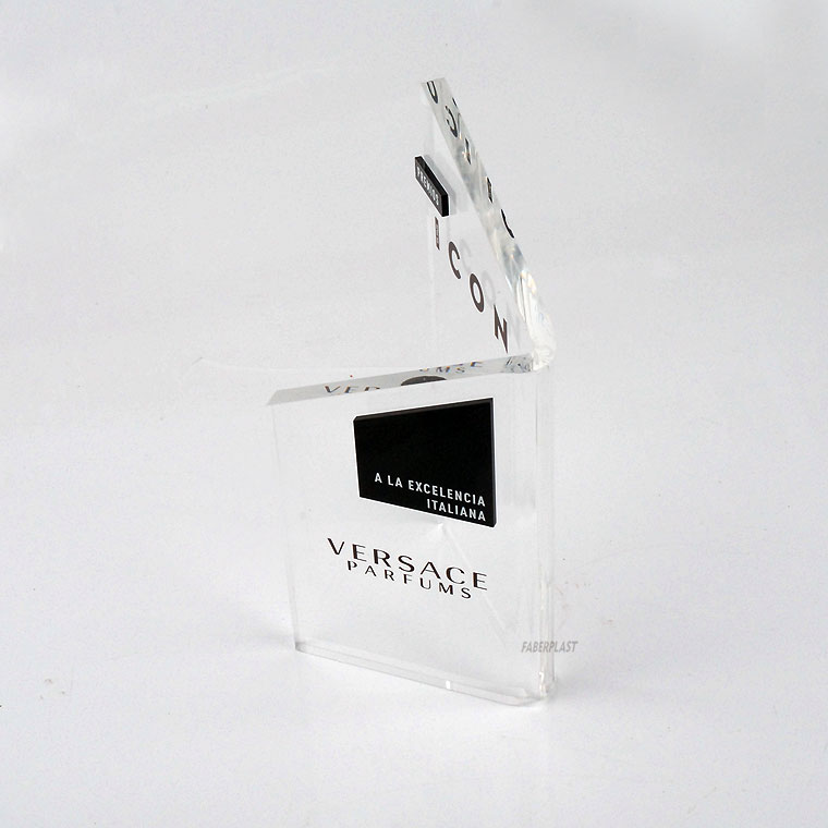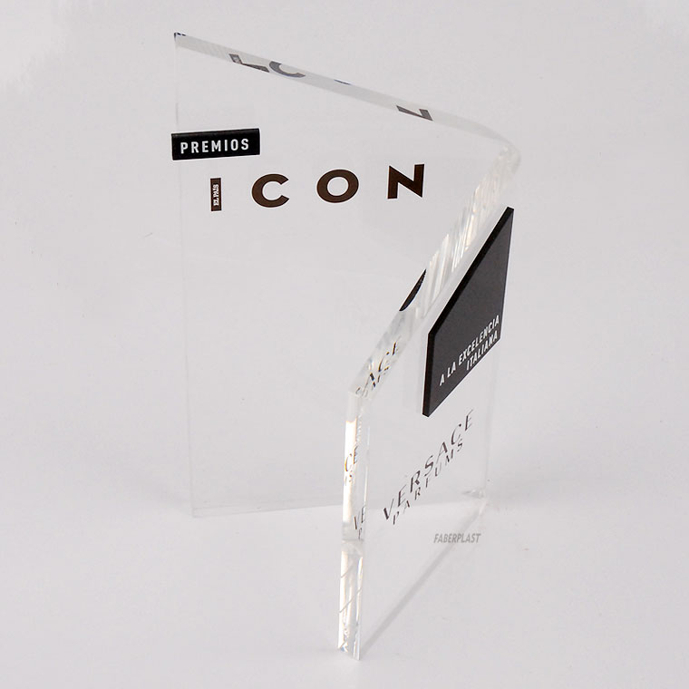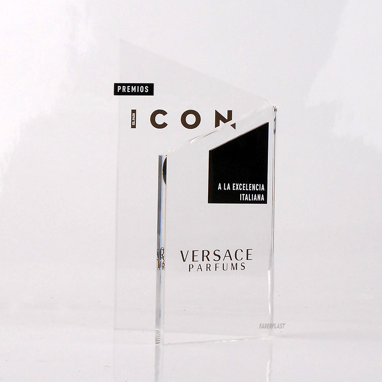 Trofeo metacrilato realizado de forma personalizada para la prestigiosa marca VERSACE en colaboración con ICON-EL PAIS. Fabricados con placas de metacrilato transparente alto espesor y metacrilato negro (Plexiglas-pmma). Decorados en impresión digital directa con logotipo y textos aportados por el cliente.