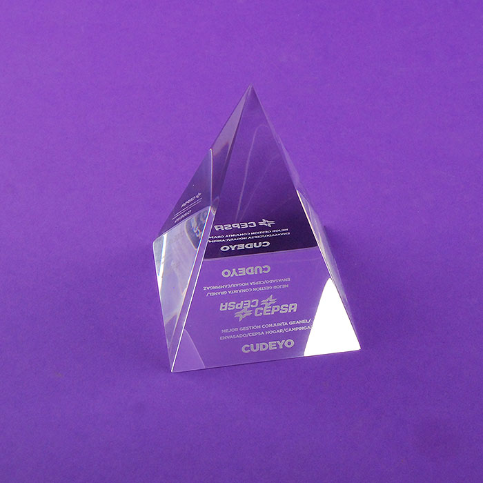 Hemos trabajado para lograr esta píramide maciza de forma artesana y minuciosamente acabada, con su forma perfecta y en punta. Fabricación de distintas unidades con metacrilato transparente (Plexiglas-pmma) impreso en digital por varias caras mediante impresión digital directa a una única tinta.