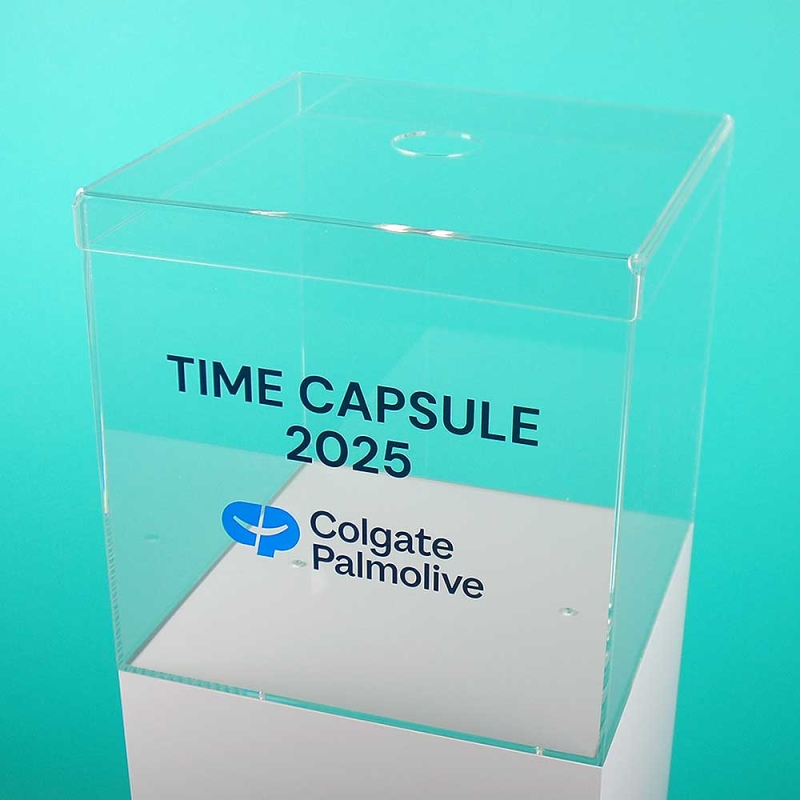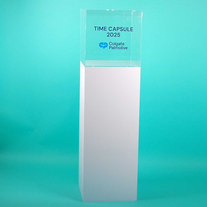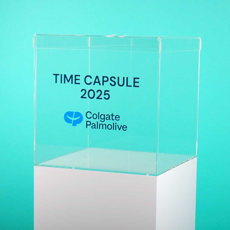 Urna expositora de metacrilato para cápsula del tiempo – Columna corporativa Colgate-Palmolive.