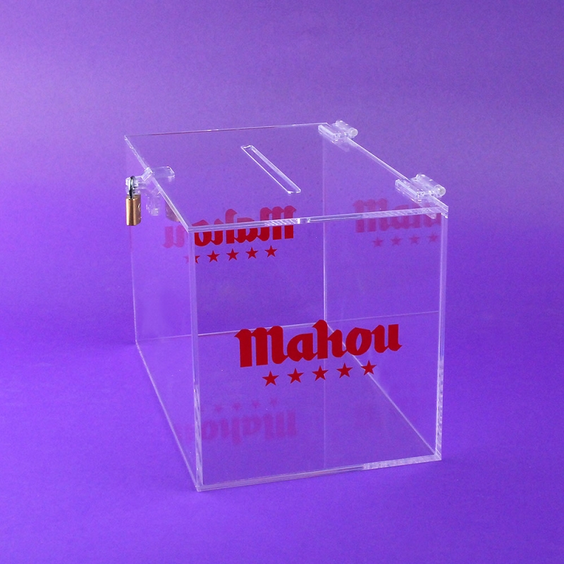 Urnas personalizadas fabricadas de forma artesana con placas de metacrilato transparente (Plexiglas®-PMMA). Incluyen candado, ranura para introducir papeles e impresión digital mediante tintas ECO-UV de alta calidad y resistencia con gran nitidez de color en varias caras. Cantos suaves y pulidos incoloros extra brillantes. Made in Spain.