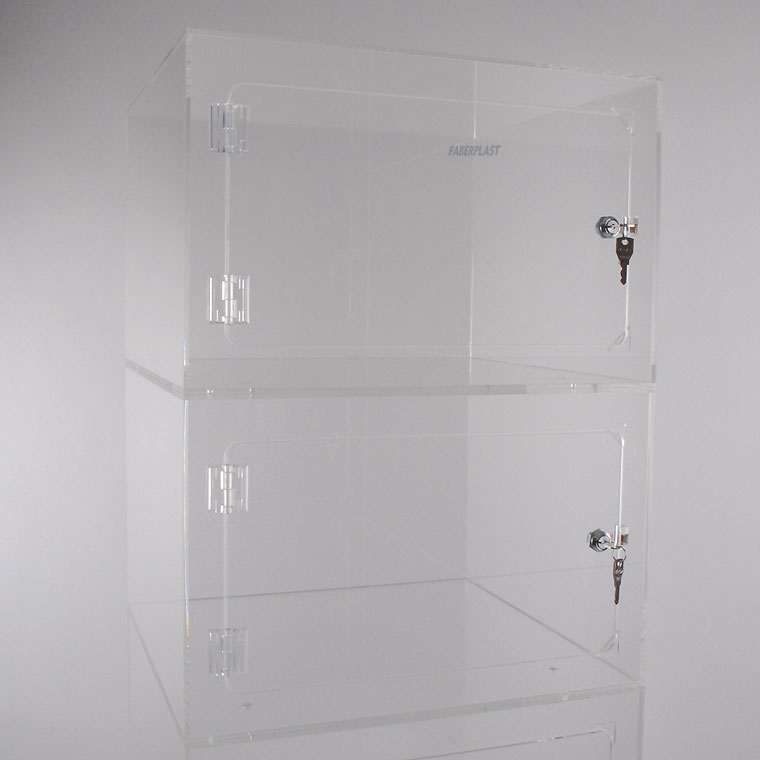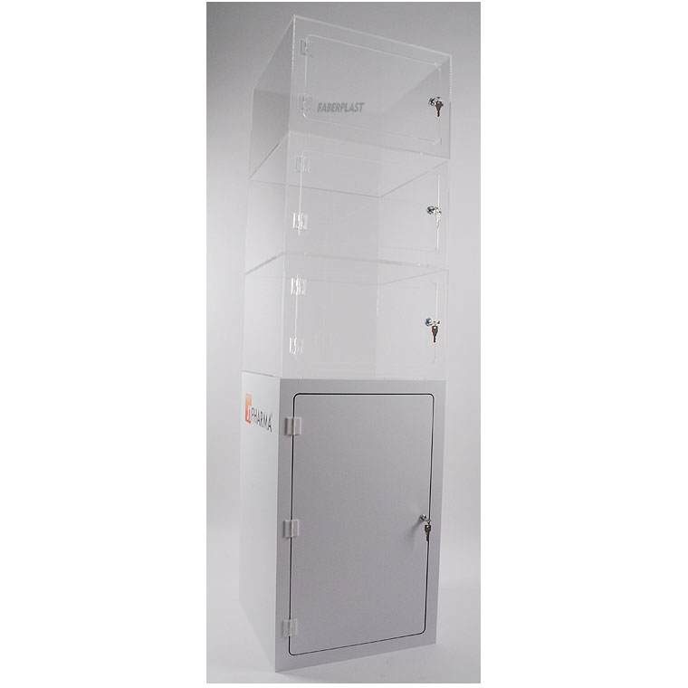 Fabricada con placas de metacrilato transparente(Plexiglas-pmma) y pvc espumado blanco, formada por 3 modulos independientes con cerradura individual, modulo inferior con cerradura y balda intermedia.