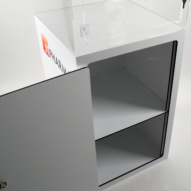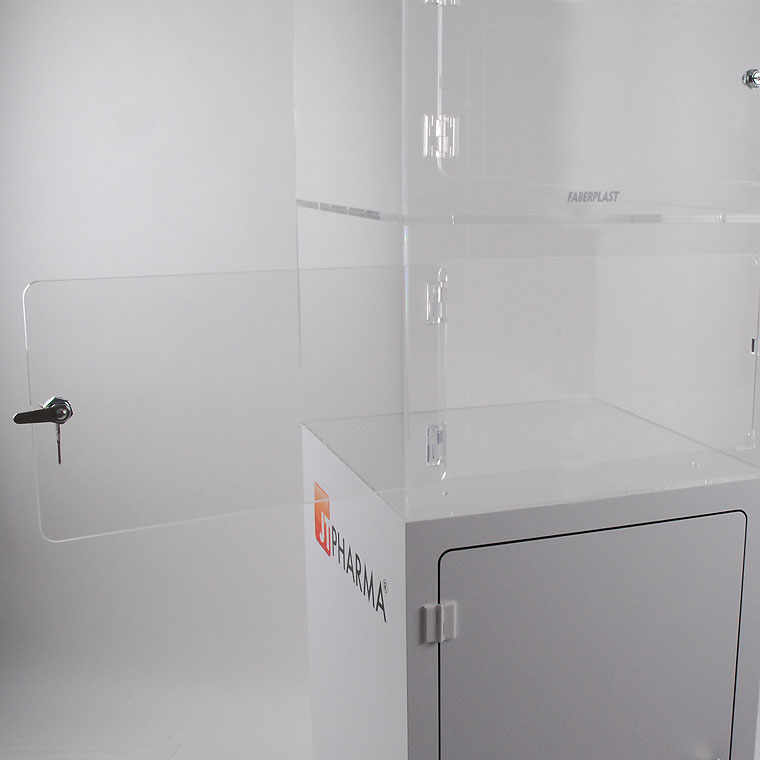 Vitrina metacrilato realizada a medida para productos de la compañía: JT PHARMA.