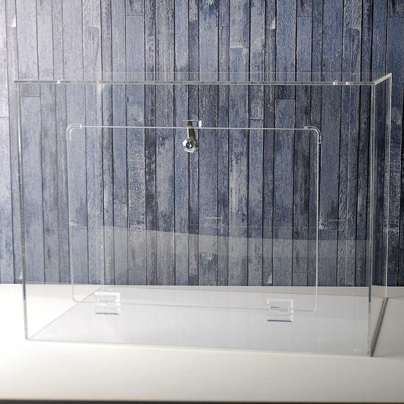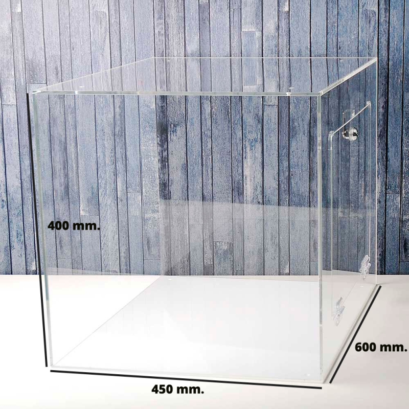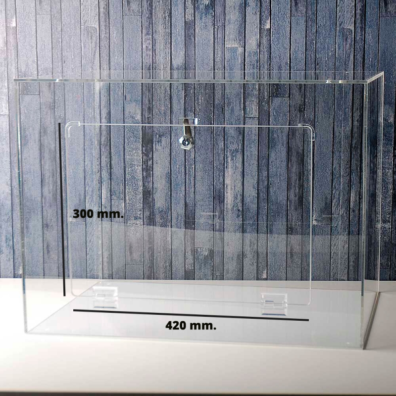 Vitrina con formato VENTANA realizada en metacrilato para todo tipo de objetos de exposición, decoración o puntos de venta. Incluye cerradura con doble llave y base BLANCA. Fabricación artesana realizada por nuestros técnicos especialistas. Tus productos y objetos siempre bien cuidados y presentados con la alta transparencia de un material noble como el metacrilato. Fabricado en España.